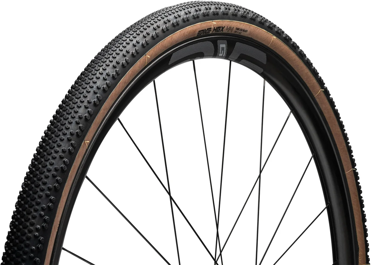 The HEX gravel tire combines the elements required for those seeking a performance option that doesn’t sacrifice traction. A novel tread design features hexagonal blocks that allow a three-way flex pattern to add suppleness to the casing, allowing the tire to conform to varied surface conditions for consistent handling. This provides both driving and braking traction for confident handling.