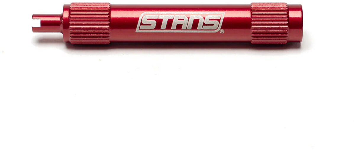 Removes Presta and Schrader valve cores. CNC machined, anodized finish with laser etched logo. Fits between spokes for quick and easy core removal. Features knurled end for a no-slip grip.
